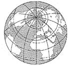 右图所示为以38°N、0°为极点的陆地相对集中的“陆半球”(另一半球为“水半球”)。读图回答1-2题。