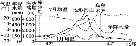 下图所表示的是新疆库尔勒到乌鲁木齐的地形剖面,以及对应的气候资料。读图回答12-13题。