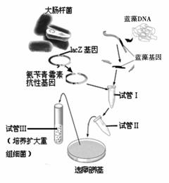(1)图示通过 方法获得蓝藻基因。作为受体大肠杆菌应 ,以方便筛选已导入重组质粒的受体大肠杆菌。取用氯化钙溶液处理过的受体大肠杆菌,置于试管Ⅱ中,完成基因工程操作 步骤。