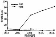 (2)[已知每个有虫株上的虫数大致相同,那么据上图可知,从2001-2006年,山坡地的沙棘木蠹蛾种群呈 增长,在 年(区段)该种群的种群增长率最高。