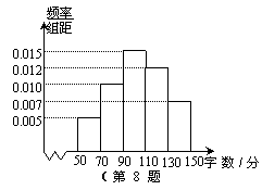 8.为了解高中生用电脑输入汉字的水平,随机抽取了部分学生进行每分钟输入汉字个数测试,下图是根据抽样测试后的数据绘制的频率分布直方图,其中每分钟输入汉字个数的范围是[50,150],样本数据分组为[50,70),[70,90), [90,110),[110,130),[130,150],已知样本中每分钟输入汉字个数小于90的人数是36,则样本中每分钟输入汉字个数大于或等于70个并且小于130个的人数是 ▲ .