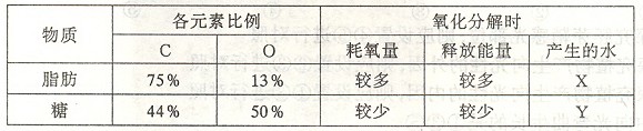 C.X<Y D.脂肪中H的比例较高,所以释放能量较多