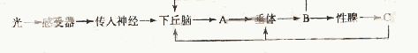 (2)上面图解中的A,B,C 分别代表由下丘脑,垂体和性腺分泌的物质,则他们分别是 、 和 。C进入血液后,通过 作用来调节下丘脑和垂体中激素的合成和分泌。