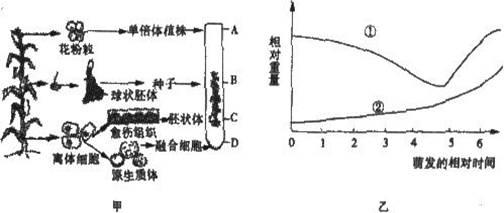 (3)C过程中,制备人工种子的关键步骤依次是经__________、___________ 阶段培育成具有生根发芽能力的胚状体 。在这一过程中细胞始终受_____ 和 ___ 等的调节,包裹胚状体的结构相当于玉米种子的______和______,“胚状体”相当于种子的_________。上图乙表示大豆种子和“人工种子”萌发过程中,二者“胚”的干重随时间的变化情况,则分别对应图中曲线 ___________________ . _________