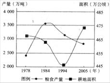 材料1 我国局部地区图 材料2 乙省粮食产量、耕地面积变化图
