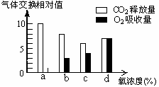 26、右图表示某植物的非绿色器官在氧浓度为a、b、c、d时,CO2释放量和O2吸收量的变化。下列相关叙述正确的是