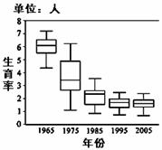 生育率是指一定年龄内每千名育龄妇女所生孩子数。下图是我国各省不同年代生育率分布的盒形图,盒内的分隔线为中位数,线段向上至最大值,向下至最小值。读后回答14-15题。