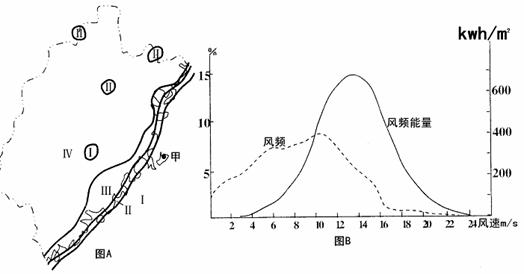 图A是我国沿海某省风能区划图,Ⅰ、Ⅱ、Ⅲ、Ⅳ分别表示风能丰富区、风能较丰富区、风能可利用区和风能贫乏区,图B是甲地全年各级风频和风频能量图,据此回答16-17题。