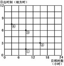 右图是不同地点6月22日的日出时刻与日照时数之间的关系,读图回答18-19题。