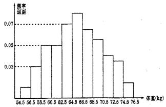 3.为了了解某地区高三学生的身体情况,抽查了该地区100名年龄为17.5岁-18岁的男生体重(kg),得到频率分布直方图如右图,根据右图可得这100名学生中体重在[56.5,64.5]的学生人数是( )