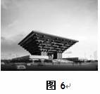 上海世博会中国国家馆(图6)建筑外观以“东方之冠”的构思主题,表达中国文化的精神与气质。国家馆居中升起、层叠出挑,成为凝聚中国元素、象征中国精神的雕塑感造型主体--东方之冠;地区馆水平展开,以舒展的平台基座的形态映衬国家馆,成为开放、柔性、亲民、层次丰富的城市广场。二者互为对仗、互相补充,共同组成表达盛世大国主题的统一整体,形成独一无二的标志性建筑群体。设计者表达的设计理念表明