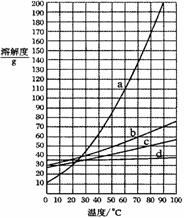 23.( )(2008年南京市)右图是A.B.C.d四种固体物质的溶解度曲线; 下表是这些固体物质在部分温度时的溶解度。根据图表信息判断下列说法正确的是