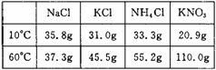 (1)10℃时KNO3的溶解度 NaCl溶解度(填“>”、“<”或“=”)。