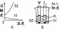 ( )26.(2008年镇江市)A图是物质M和N的溶解度曲线。B图中甲、乙试管分别盛有M、N的饱和溶液,试管底均有未溶解的M、N固体。向烧杯中加入一种物质后,甲中的固体减少,乙中的固体增加,则加入的物质不可能是A.浓硫酸