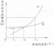 (1)t1℃时,向两只盛有100g水的烧杯中,分别加入A.B两种物质至不能溶解为止,所得溶液的溶质质量分数较大的是___________溶液(填“A”或“B””)。