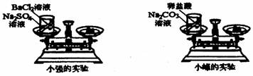 他们先使天平平衡,称出烧杯、小试管、药品的总质量。然后将小试管里的药品倒入烧杯中,观察现象。待反应完全后,再次称量其总质量。请你与他们一起探究: