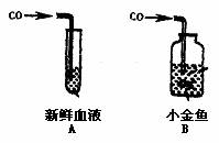 (4)某同学设计了下面两个实验来探究一氧化碳的性质,如下图所示:分别通入一氧化碳一段时间后,发现A中血液颜色变黑,B中的小金鱼仍然活着。通过实验A,该同学想证明一氧化碳有毒,你认为通过实验B,该同学想证明一氧化碳的另一条性质是___________。