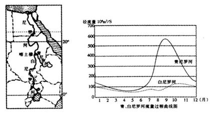 32、下图为尼罗河水系及主要干支流流量过程曲线图。读图回答下列问题: