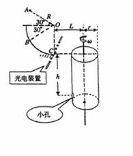 光滑圆弧轨道竖直固定,过最低点的半径OC处于竖直位置.其右方有底面半径r=0.2m的转筒,转筒顶端与C等高,下部有一小孔,距顶端h=0.8m.转筒的轴线与圆弧轨道在同一竖直平面内,开始时小孔也在这一平面内的图示位置.今让一质量m=0.1kg的小物块自A点由静止开始下落后打在圆弧轨道上的B点,但未反弹,在瞬问碰撞过程中,小物块沿半径方向的分速度立刻减为O,而沿切线方向的分速度不变.此后,小物块沿圆弧轨道滑下,到达C点时触动光电装置,使转简立刻以某一角速度匀速转动起来,且小物块最终正好进入小孔.已知A、B到圆心O的距离均为R,与水平方向的夹角均为θ=30°,不计空气阻力,g取l0m/s2.求: