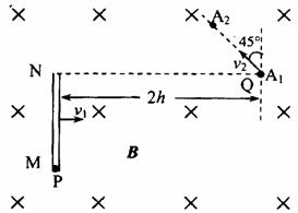 如图所示,在光滑绝缘水平面上平放着一内壁光滑、绝缘的空心细管,管内M端有一带正电的小球P,在距离管的N端正右方2h的A1处有另一不带电的小球Q,存足够大空间区域有竖直向下的匀强磁场,磁感强皮为B。现让细管以垂直管长方向的速度v1水平向右匀速运动,同时让Q以某速度v2从A1点出发沿A1A2匀速运动,细管运动到A1处时,A1A2与细管延长线的夹角为45°。若小球P恰好在A处相对水平面以速度