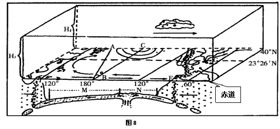 (二)读地理景观模式示意图(图8),AB表示昏线,B点经度为1800 ,H1和H2分别代表当地对流层的高度,此时南极圈以内全部出现极昼现象。回答下列问题(11分)