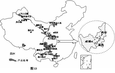 材料一:我国西部大开发重点产业地带空间分布图(图13)