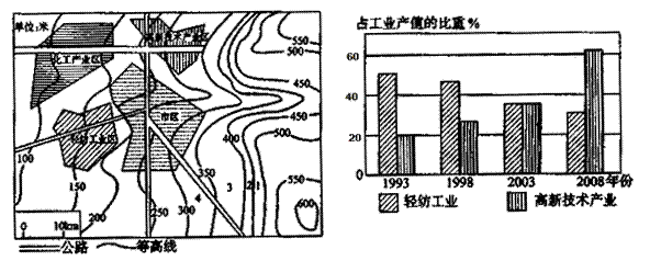 材料一:M市等高线地形图 材料二:M市主导工业产值统计图