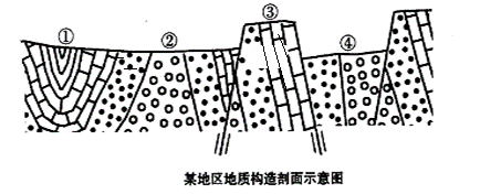 1.图中①②③④四处,在地质构造上属于背斜的是 ,属于向斜的是 ,属于地垒的是 ,属于地堑的是 ;该地区富含石油、天然气,则宜开采的地点是 ,其大多属于 代沉积地层。