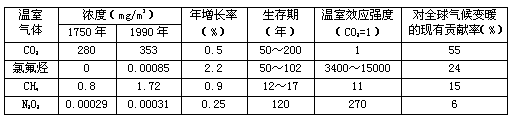 (二)读主要温室气体对全球气候变暖影响程度对比表。