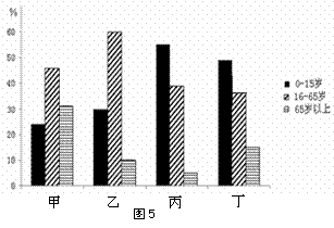 (六)图5表示甲、乙、丙、丁四个国家2008年0-15岁、15-65岁、65岁以上三个年龄段人口占总人口的比重,读图回答。