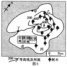 (八)图8是地处热带太平洋中的一个岛屿,该岛盛行较强的东南风,有流速较大的河流及森林。现欲对该岛进行开发,据此并结合图回答。