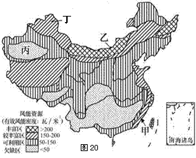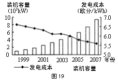 (六)能源问题一直是制约各国发展的问题。2010年2月27日,我国首座大型海上风电场--东海大桥海上风电场全部34台风机安装取得圆满成功,图19表示全球风电装机容量和发电成本的变化,图20是我国风能资源分布情况