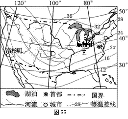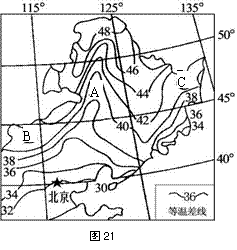 (七)读“中国东北部地区气温年较差分布图”(图21)和“美国本土气温年较差分布图”(图22),分析回答下列问题。( 19分)