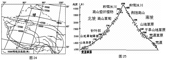 (十)读我国西部地区雪线高度分布图(图24)及甲地区地理现象图(图25 ),回答下列问题。(10分)