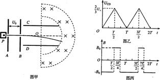 L/3.两板之间的电压UCD随时间t变化的图象如图乙所示.在金属板C、D右侧有二个垂直纸面向里的均匀磁场分布在图示的半环形带中,该环带的内、外圆心与金属板C、D的中心O点重合,内圆半径Rl=