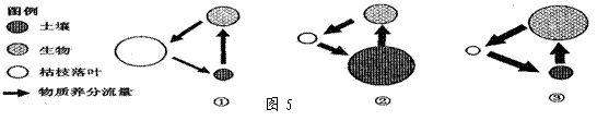 图5是低、中、高三个不同纬度的自然带(生态系统)物质流动示意图。图中圆圈的大小表示所储存养分的多少,箭头的粗细表示物质养分流量的大小。读图回答11-12题。
