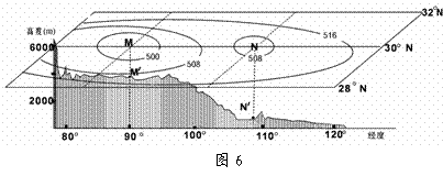 图6阴影部分为沿30oN的部分区域垂直剖面图,平行四边形内为与该区域对应的6000米高空水平面某时等压线(单位:hpa)分布状况。读图回答15-16题。