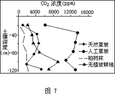 图7为云贵高原某地区不同植被下土壤空气中CO2浓度示意图,读图完成17-19题。