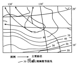 读图8“某地理现象移动路径和盛行期频数等值线图”,回答20-22题。