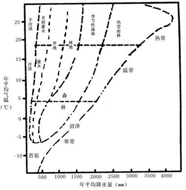 (1)从图中可以看到,森林分布的极端界限条件大约是气温__ ___℃以上,降水 ㎜以上。(2分)