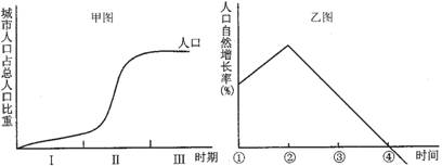 读世界城市化进程图(甲)和某国人口自然增长率变化图(乙),回答11-13题: