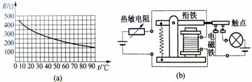 21.如图所示,图(a)为半导体材料做成的热敏电阻的电阻值随温度变化的曲线,而图(b)则是用这个热敏电阻和继电器做成的温控电路.设电磁铁线圈的电阻为50Ω,线圈中的电流大于或等于20mA时,继电器的衔铁被吸合,已知左侧电源的电动势为6V,电源的内电阻不计,则继电器中吸合衔铁的部件是_______________,要使右则电路中的小灯泡发光,温度的范围应是______________.