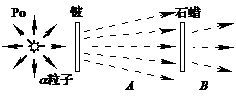 图为查德威克实验示意图,由天然放射性元素钋(Po)放出的A射线轰击铍时会产生粒子流A,用粒子流A轰击石蜡时会打出粒子流B,经研究知道.[ ]
