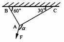 如图所示两绳AB、AC相交于A点,两绳与天花板间夹角大小分别为600和300,现用一力F作用于交点A,与右绳夹角为