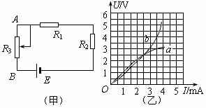 (8分)在如图(甲)所示的电路中,电阻R1 和R2都是纯电阻,它们的伏安特性曲线分别如图(乙)中Oa、Ob所示。电源的电动势