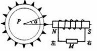 现代汽车中有一种先进的制动系统一一防抱死(ABS)系统。它有一个自动控制刹车系统的装置,原理如图.铁质齿轮P与车轮同步转动。右端有一个绕有线圈的的磁体,M是一个电流检测器.当车轮带动齿轮转动时,线圈中会产生感应电流。这是由于齿靠近线圈时被磁化,使通过线圈的磁通量增大,齿离开线圈时又使磁能量减小,从而能使线圈中产生感应电流.这个电流经电子装置放大后能控制制动机构.齿轮 P 从图示位置按顺时针方向转过α角的过程中,通过 M 的感应电流的方向是( )