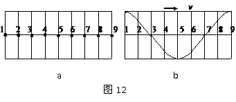 在均匀介质中选取平衡位置在同一直线上的9个质点,相邻两质点的距离均为L,如图12中a所示,一列横波沿该直线向右传播,t=0时到达质点1,质点1开始向下运动,经过时间Dt第一次出现如图12中b所示波形,则该波的( BD )