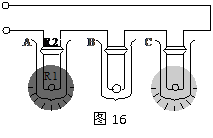 装饰用的彩灯,串成一串串,接在220V电源上,观察灯的结构发现,每个灯的灯丝(R1)引线上方绕有金属电阻丝(R2),如图16所示;即使R1断了,R2仍能导电。根据工作特性,R1应该________R2(填“大于”、“等于”或“小于”),当其中一个或几个灯的灯丝断了,其余的灯将__________(填“变亮”、“变暗”或“完全熄灭”)。