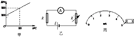 (1)如图(甲)是由某金属材料制成的电阻R随摄氏温度t变化的图象,若用该电阻与电池(电动势E=1.5V,内阻不计)、电流表(量程为5mA、内阻不计)、电阻箱R′ 串联起来,连接成如图(乙)所示的电路,用该电阻做测温探头,把电流表的电流刻度改为相应的温度刻度,就得到了一个简单的“金属电阻温度计”。