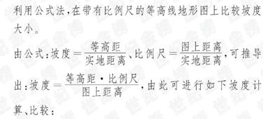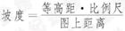 在等高线地形图中,坡度是指山坡的倾斜角度。通常用坡面与水平面所成的二面角来表示。如图中α角。α角大小的衡量可采用数学三角函数的正切函数进行表示,即tgα(0°≤0≤90°)。因为正切函数在区间(0,π/2)为单增曲线。所以可用比值进行比较。H表示坡高(即相对高度),与等高线地形图中等高距有关系。L表示坡宽(坡宽=图上距离/比例尺)。坡度α的大小就可以用等高距与比例尺的关系进行表示。